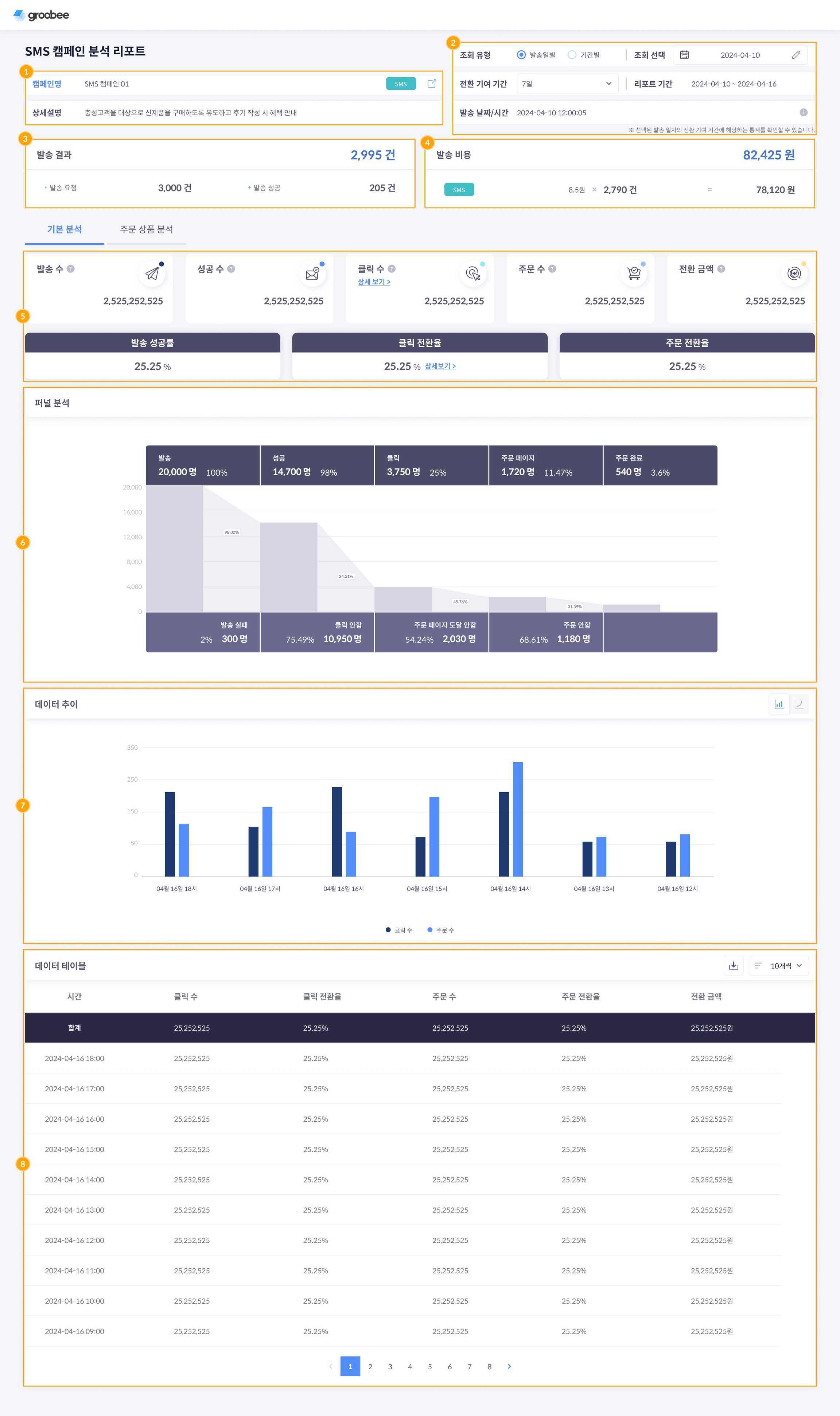 타겟팅 된 고객에게 캠페인을 발송, 수신부터 주문 전환에 이르기까지의 흐름을 시각화하고 단계별로 수치와 비중을 표시합니다.