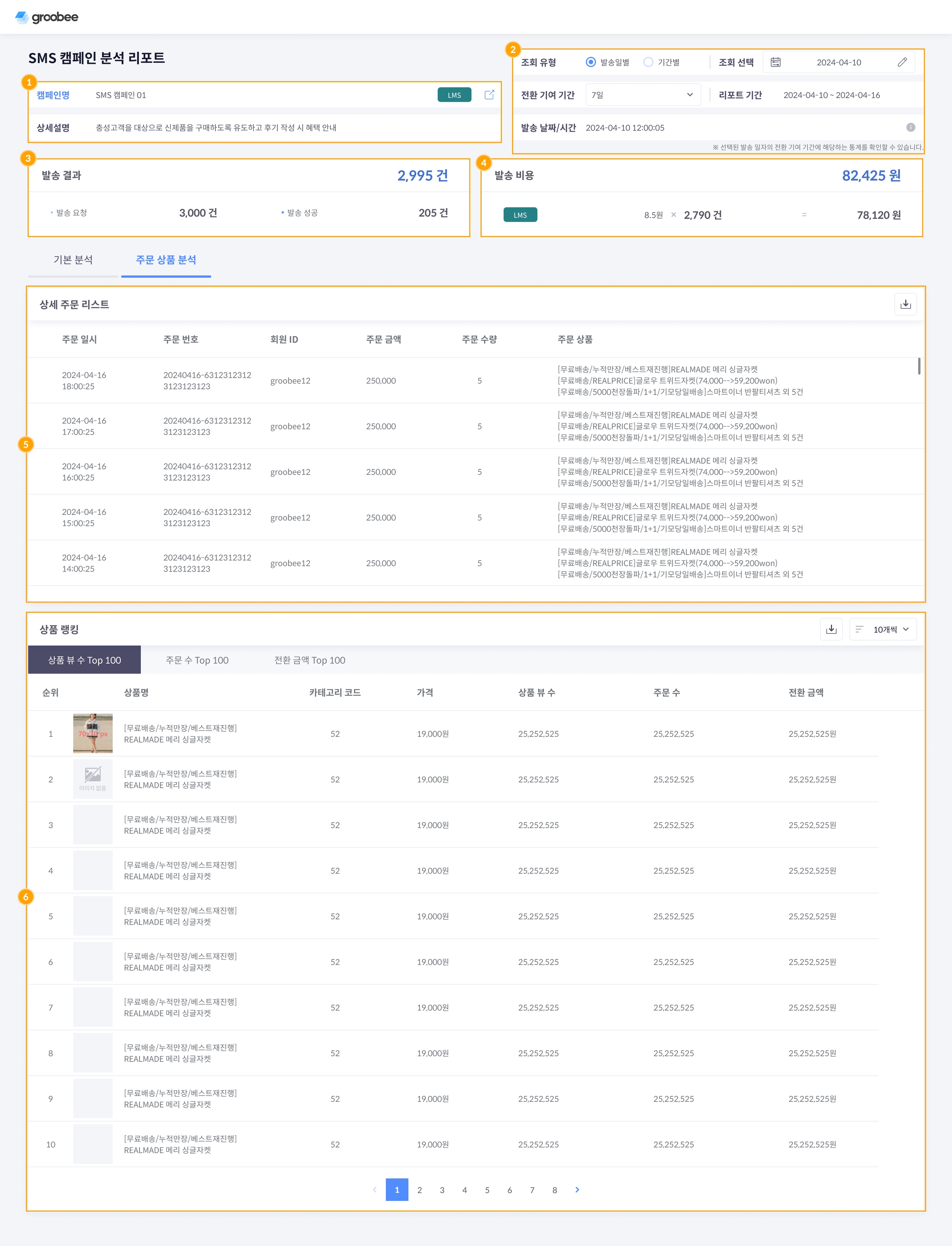 캠페인 분석 리포트의 주문 상품 분석을 통해 선택한 캠페인을 통한 주문 이력과 상품 랭킹을 확인할 수 있습니다.
