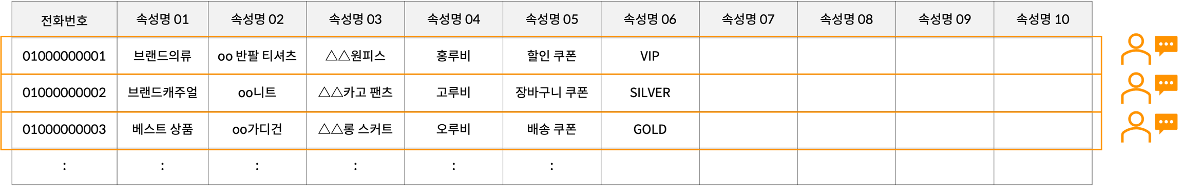 한 행의 데이터는 한 유저에 보낼 수 있는 데이터입니다.