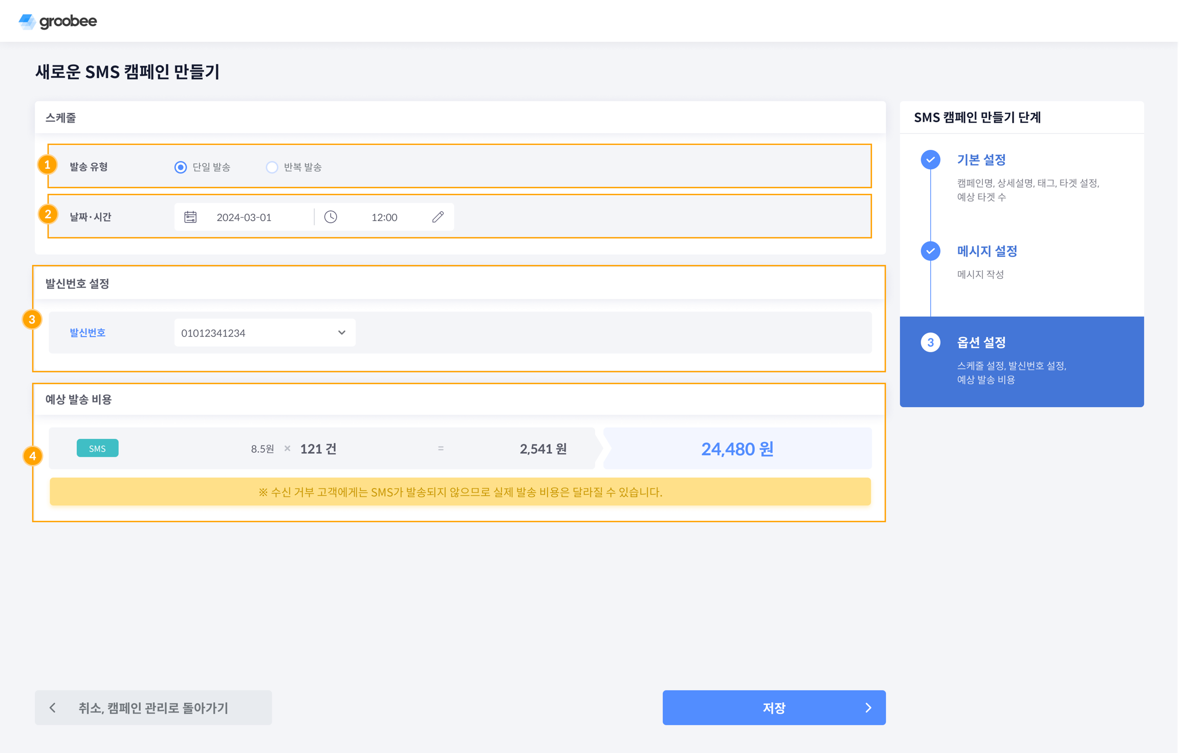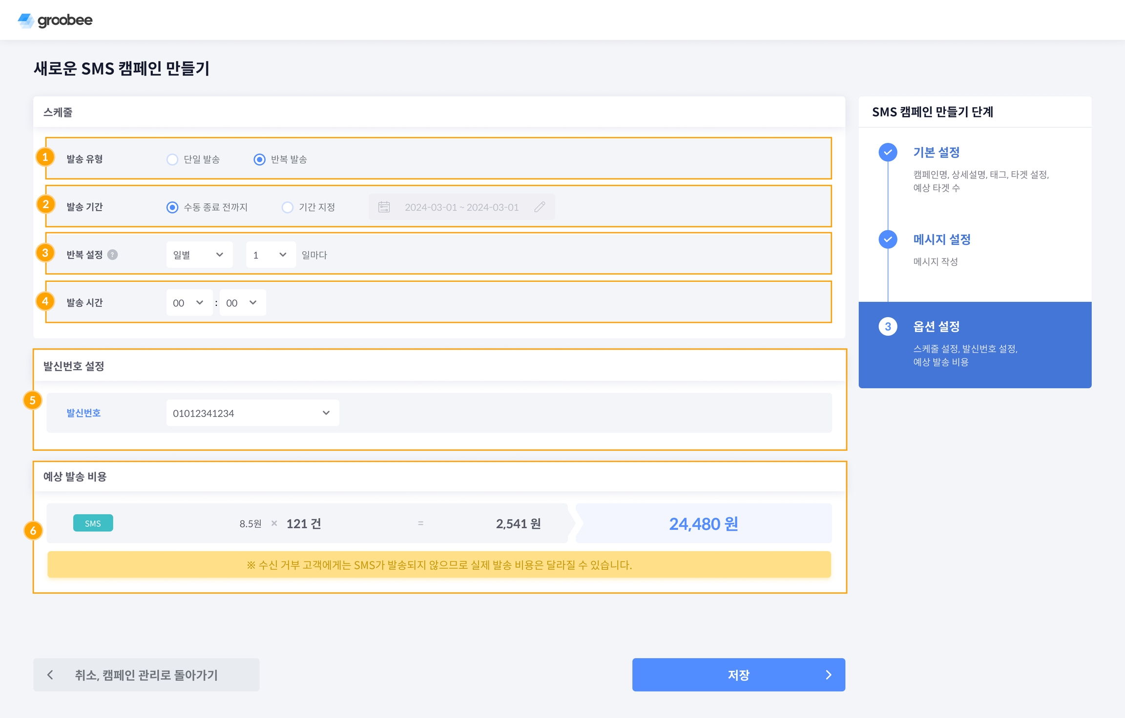 SMS 캠페인 3단계 옵션 설정