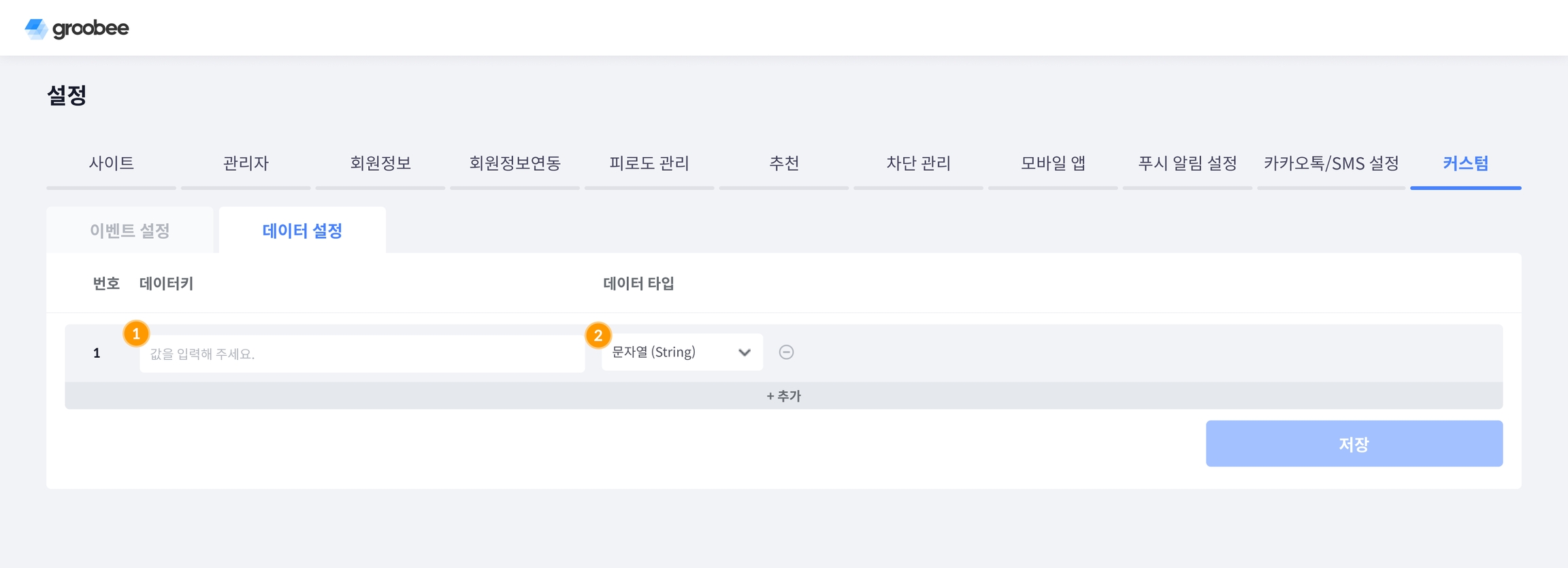 데이터 생성 : 설정 > 커스텀 데이터 화면에서 데이터키와 데이터 타입을 지정한 뒤 저장합니다.