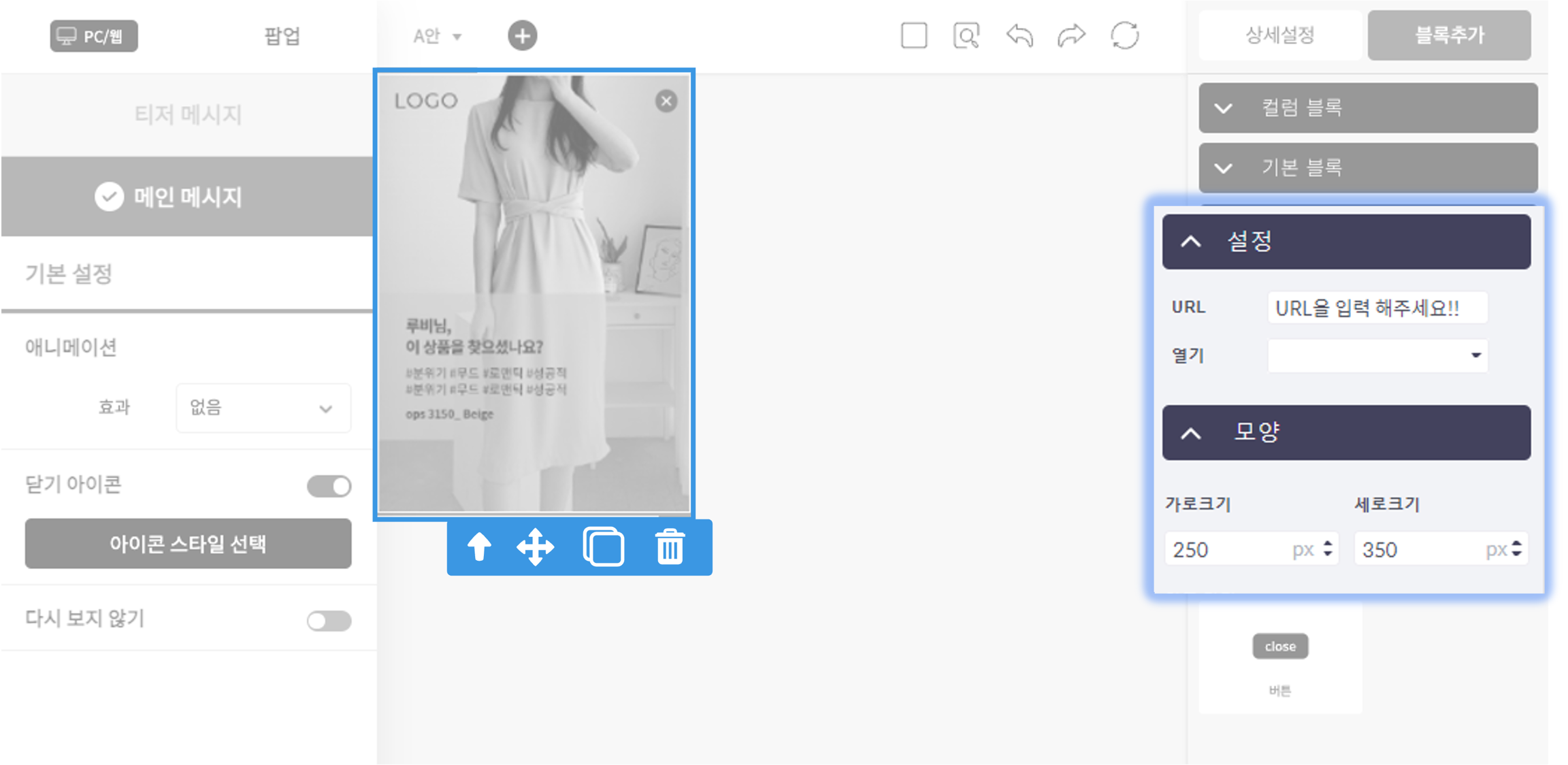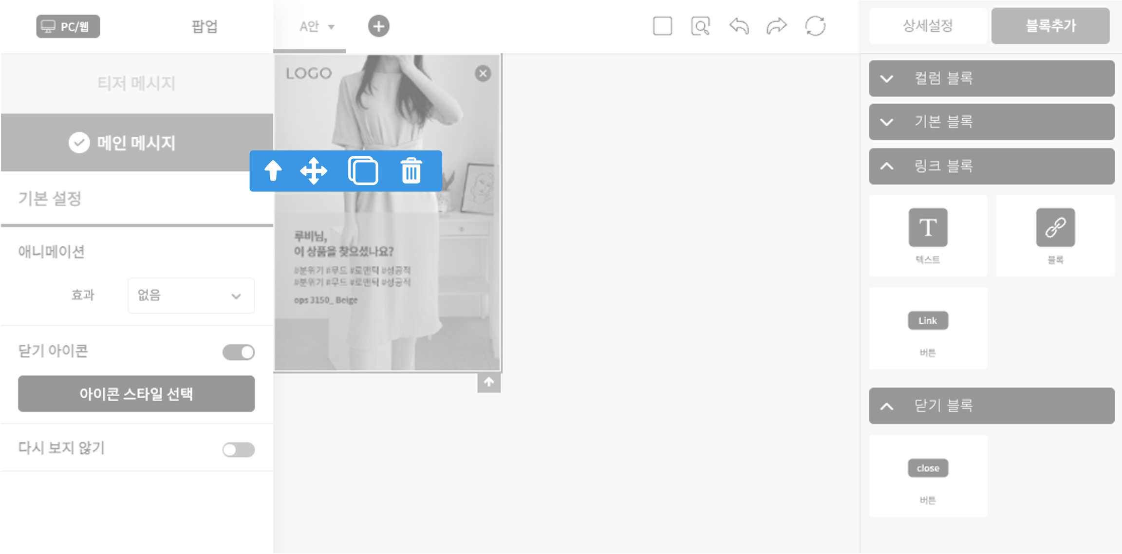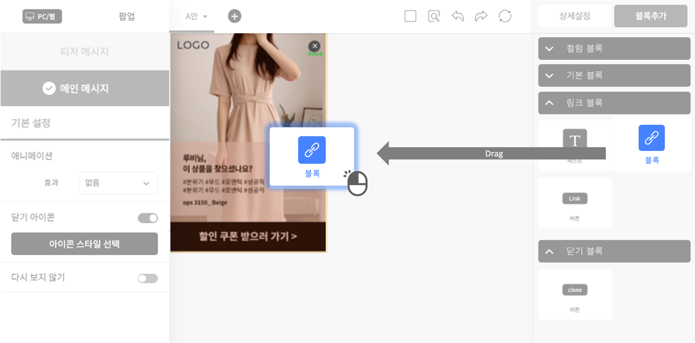 고객을 유도하고자 하는 특정 페이지로 링크를 설정하고 싶다면 메시지 영역 전체에 링크 블록을 추가하는 작업을 진행해 주세요.